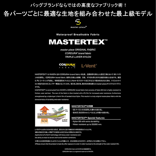 素材は耐久性、耐水性に優れたオリジナルファブリックMASTERTEX-04を使用。随所にデザインされた高級感を演出する牛革部分には、防水鞣し加工が施されています。 表面には撥水加工、裏面には特殊透湿防水フィルムをラミネート加工しトリコットナイロンを貼り合わせた3層構造による耐水圧20,000mmレベルの防水機能を備えています。