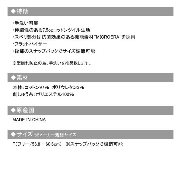 素材は伸縮性のある7.5ozのコットンツイルを使用。オールシーズンで着用が可能なので、型崩れ防止のために丁寧に手洗いをして長くご愛用いただきたいキャップです。 内側のスベリ部分は抗菌効果のある“MICROERA”が採用され、汗をかいても快適な被り心地をキープします。