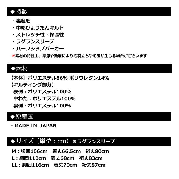 ハイストレッチの裏起毛ニット素材と中綿キルトナイロンの異素材をコンビにしたハーフジップパーカーです。