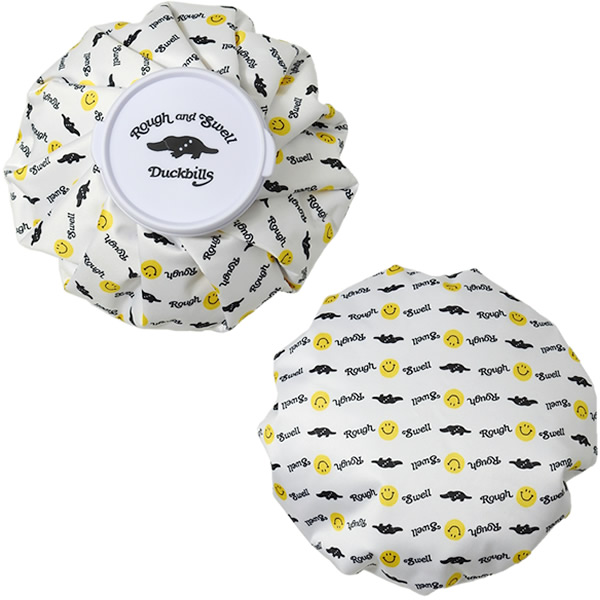 また、“ROUGH AND SWELL”“Duckbills”の文字とオリジナルのスマイルボールとカモノハシのアイコンがMIXパターンの総柄で、リズミカルに並んだレイアウトが可愛い氷嚢です。 キャップ部分にも“Rough and Swell Duckbills”の文字とカモノハシのアイコンのデザインが愛らしい♪