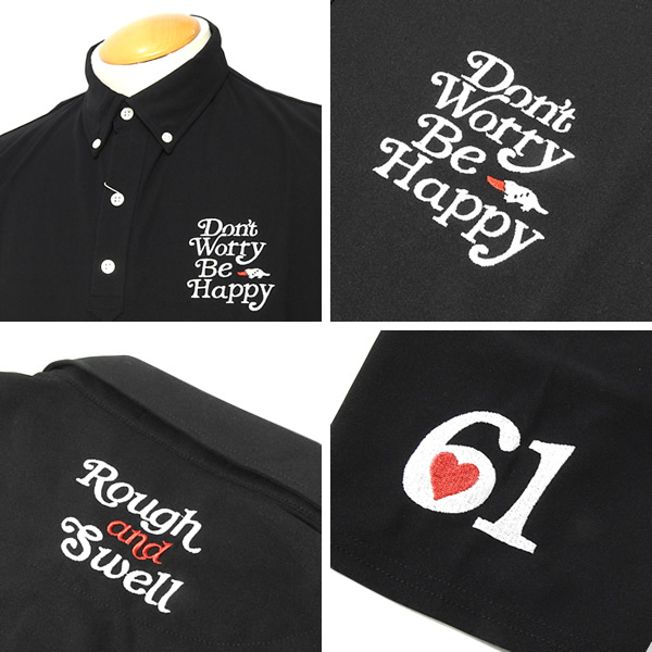 左胸は「Don't Worry Be Happy」ロゴ、首後ろ部分は「Rough and Swell」の文字、左袖には「61」ロゴをそれぞれ刺繍でレイアウト。 「くよくよしなしで楽しくいこうぜ!」とrough&swellらしい茶目っ気あるメッセージが込められたルックスに仕上げられています。