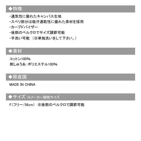 素材は通気性に優れたキャンバス生地を使用。耐久性にも優れ丈夫な仕上がりです。 内側の額に当たるスベリ部分には汗を素早く吸収・乾かす吸汗速乾性に優れた素材を採用。 蒸れにくく快適な被り心地と、汗によるべたつきなどを感じさせず快適をキープします。 サイズ調節は後部のベルクロで簡単に行うことができます。