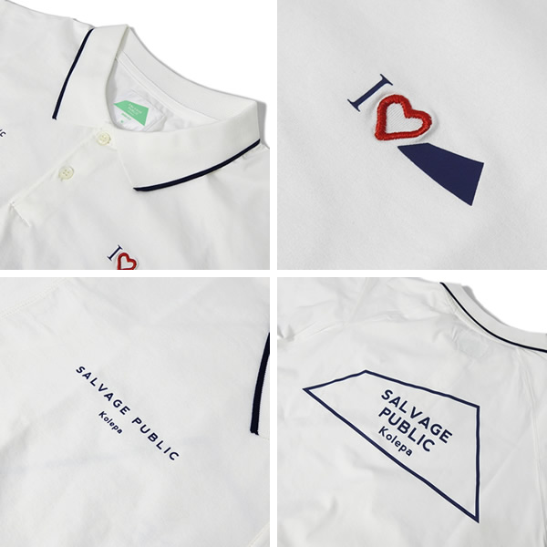フロントは、右胸に「SALVAGE PUBLIC Kolepa」スタンプロゴをプリントでレイアウト。左胸には“I♥Diamond Head”をプリントと3D刺繍のミックスでデザインしました。 バックデザインは、ダイアモンドヘッドロゴを大きくプリントでレイアウトしインパクトある仕上がりです。 また、首元は2つボタン仕立てで、襟はピンストライプ入りのリブ仕様に切り替えたデザイン。 すっきりしたシルエットにプレー中の体の動きを考えて作られたスプリットラグランスリーブを採用し、肩回りの動きを妨げず自然な肩の落ち感を演出しています。