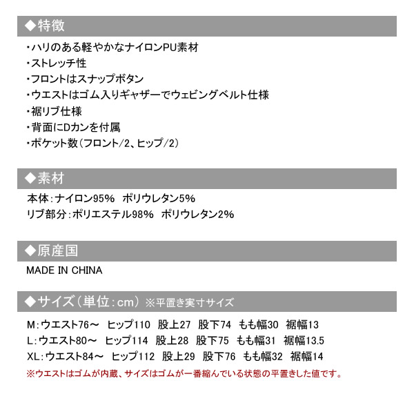 また、ウエストはウェビングベルト仕様且つ、ゴム入りギャザータイプなので体の動きに合わせて腰回りの動きもサポートします。